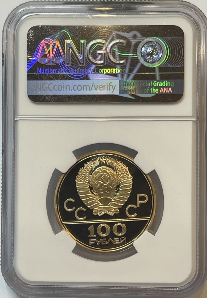 Золотая монета 100 рублей "Велотрек" Олимпиада 80. 1979г. ЛМД в слабе NGC PROOF 69 ULTRA CAMEO