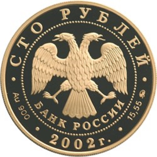 в центре диска - эмблема Банка России (двуглавый орел с опущенными крыльями, под ним надпись полукругом "БАНК РОССИИ"), обрамленная кругом из точек и надписями по кругу вверху - "СТО РУБЛЕЙ", внизу - "2002 г.", слева - обозначение металла, проба сплава, справа - содержание драгоценного металла в чистоте и товарный знак монетного двора.