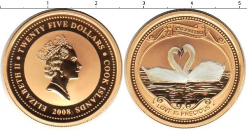 Золотая монета 25 долларов (dollars) 2008 "Любовь драгоценна" (Лебеди) Острова Кука) 1/2 oz