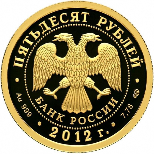 в центре диска - эмблема Банка России (двуглавый орел с опущенными крыльями, под ним - надпись полукругом "БАНК РОССИИ"), обрамленная кругом из точек и надписями по кругу - вверху: "ПЯТЬДЕСЯТ РУБЛЕЙ", внизу: слева - обозначения драгоценного металла и пробы сплава, в центре - дата выпуска "2012 г.", справа - содержание химически чистого металла и товарный знак монетного двора.