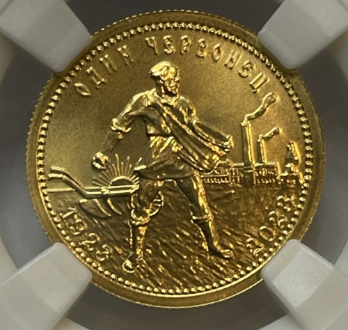 Однако для оборота выпускали не только бумажные деньги. С 1923 года на Петроградском монетном дворе начали выпускать золотые монеты-червонцы, которые по своим параметрам повторяли царские 10 рублей. Их дизайн был разработан медальером Антоном Васютинским на основе эскиза для одной из дореволюционных сельскохозяйственных выставок. На монете в полный рост изображен крестьянин-сеятель на фоне дымящихся труб, плуга и восходящего солнца. Золотых червонцев, датированных 1923 годом, было выпущено чуть более 2,7 млн штук.