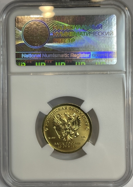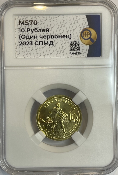 Золотая монета 10 рублей "Червонец Сеятель" СПМД в слабе ННР MS 70, 2023 г.
