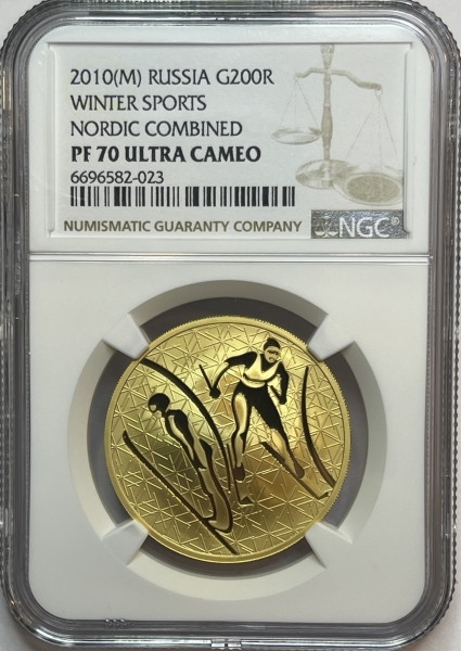 Золотая монета "Лыжное двоеборье", 200 рублей, 2010 год, в слабе NGC PROOF 70 ULTRA CAMEO